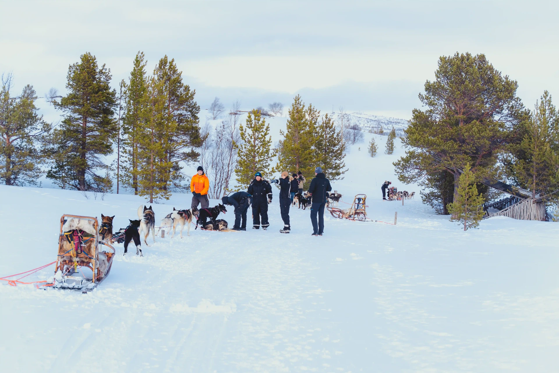Upon arrival, you are welcomed at the dog yard by one of our guides, and outfitted with the essential gear - including thermal suits, boots, and gloves - ensuring comfort and warmth for the adventure ahead. Each sled is steered by an experienced musher, and you sit in pairs as passengers, allowing you to fully enjoy the scenery and experience. The tour covers approximately 6 kilometers and follows a scenic route along the classic lightly forested wilderness of Arctic Norway. A short stop is included midway, giving some time to rest the dogs and hear stories from the trail. After the sledding tour, upon return to the Snowhotel, your driver is ready to take you back to your hotel in Kirkenes.